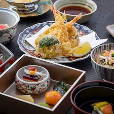・ランチ和会席「碧」(2名様より) ¥7,500 (¥8,250):前菜・椀・造り・焼物・煮物・天麩羅盛り合わせ・煮物・季節の御飯・デザート